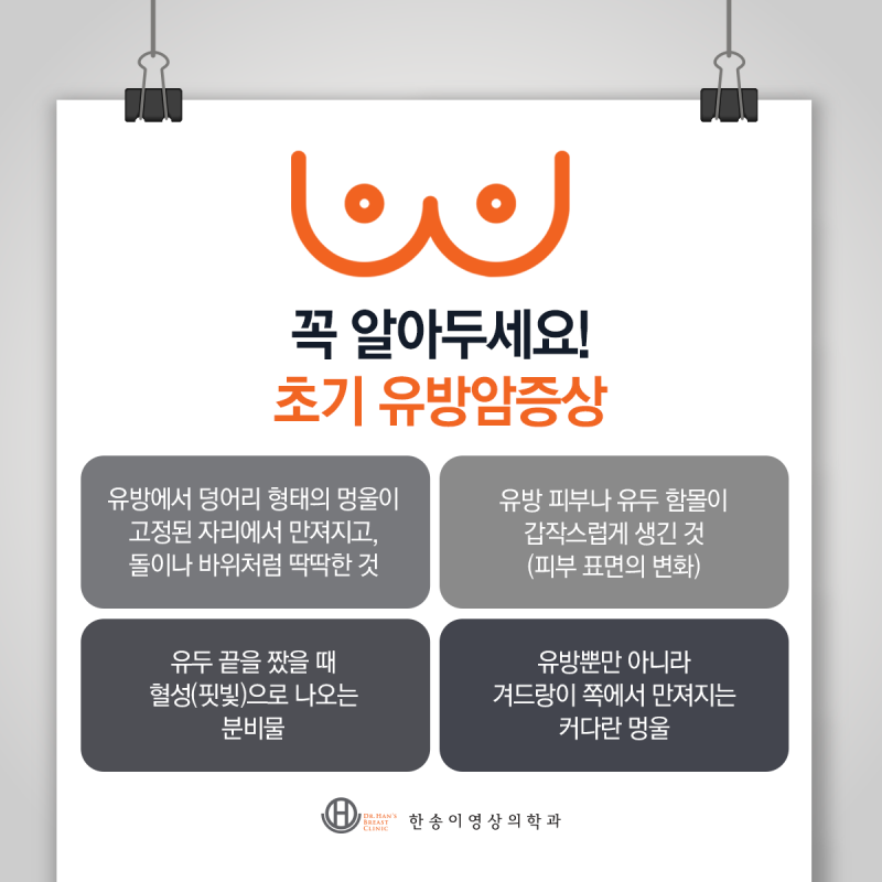 평소 신선한 채소와 과일을 섭취해 주시는 것도 도움이 됩니다. 무엇보다 유방암은 초기 증상이 뚜렷하게 나타나는 것은 아니므로 혹을 만지거나 유두에서 피가 섞인 분비물이 나오거나 유두에 습진이 생겨 불편함이 나타난다면 반드시 확인해 보시기 바랍니다. 유방암 증상이 나타나기 전에도 평소 자가진단으로 반드시 체크하면서 정기적인 유방암 검진을 받는 것이 좋습니다.