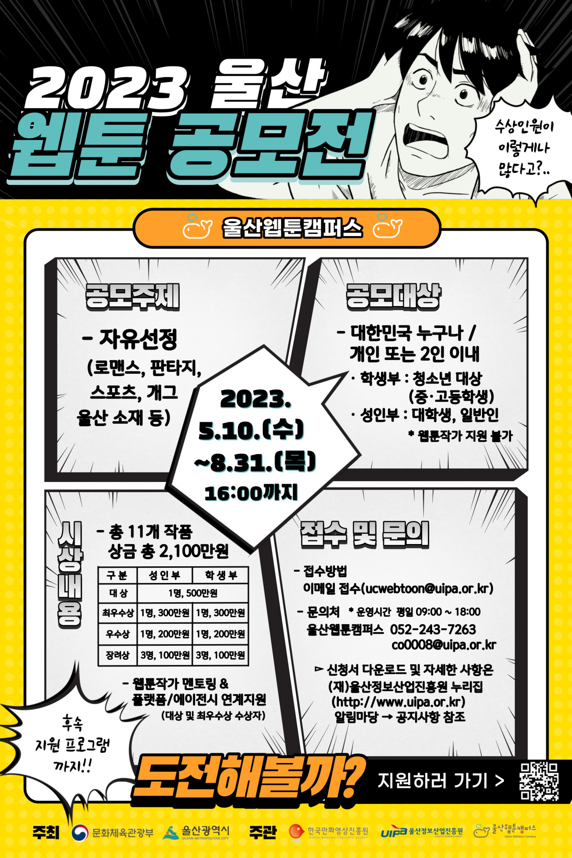 개요내용접수기간 2023년 7월 12일(수) 10:00~8월 18일(금) 17:00 참가종목 만화, 상황표현, 캐릭터, 카툰, 웹툰 수상발표 2023년 8월 28일(월) 엠굿 월간미대입시 홈페이지 발표 및 온라인 전시 주최·주관 주최: 서일대학교 미디어예술학부 웹툰스토리텔링학과 협찬: 엠굿 월간미대입시